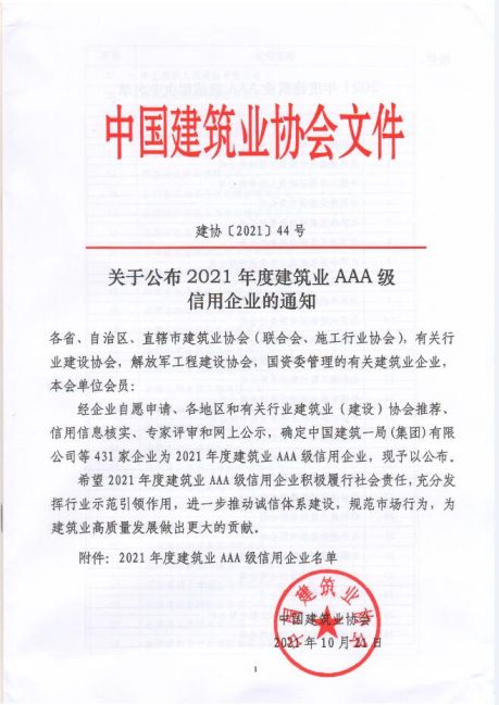 近日,由中國建筑業協會組織開展的2021年度建筑業AAA級信用企業評選結果公布,山東濱州城建集團有限公司經過復評,再次被評為AAA級信用企業。